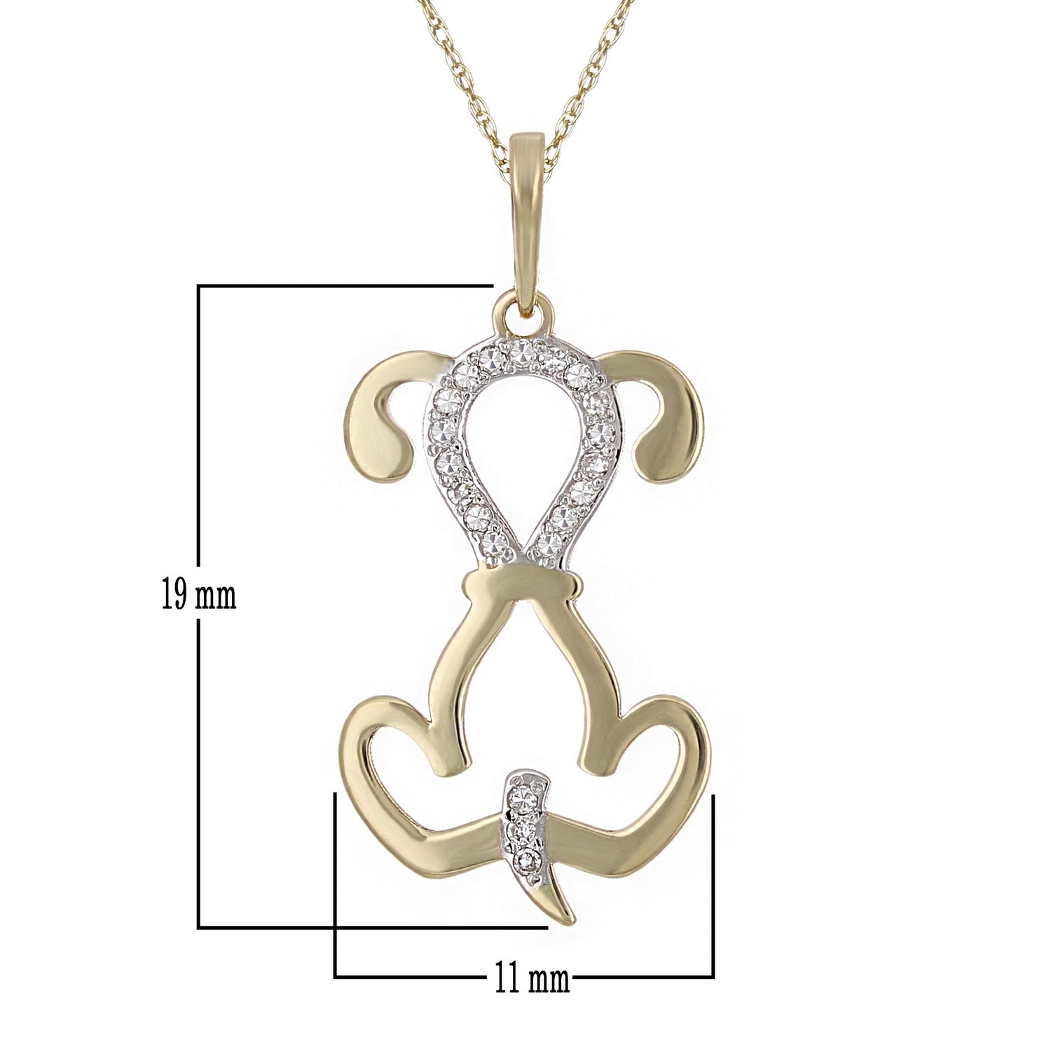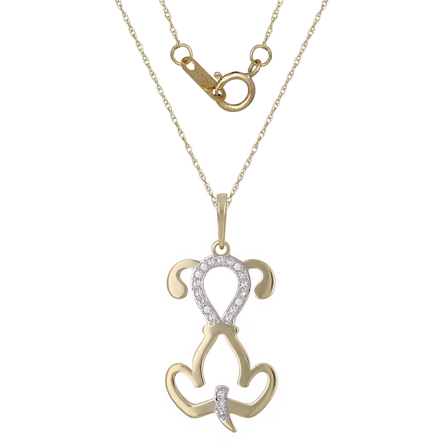 Made of real 10 karat gold, this exquisite white-diamond puppy-dog shaped pendant complements every style and is a lovely addition to your jewelry collection. Measuring 3/4" in height, this yellow gold pendant is hand crafted to a perfect size which is durable and looks elegant and stylish. In addition, the secure spring ring clasp style makes it easy and comfortable to wear.