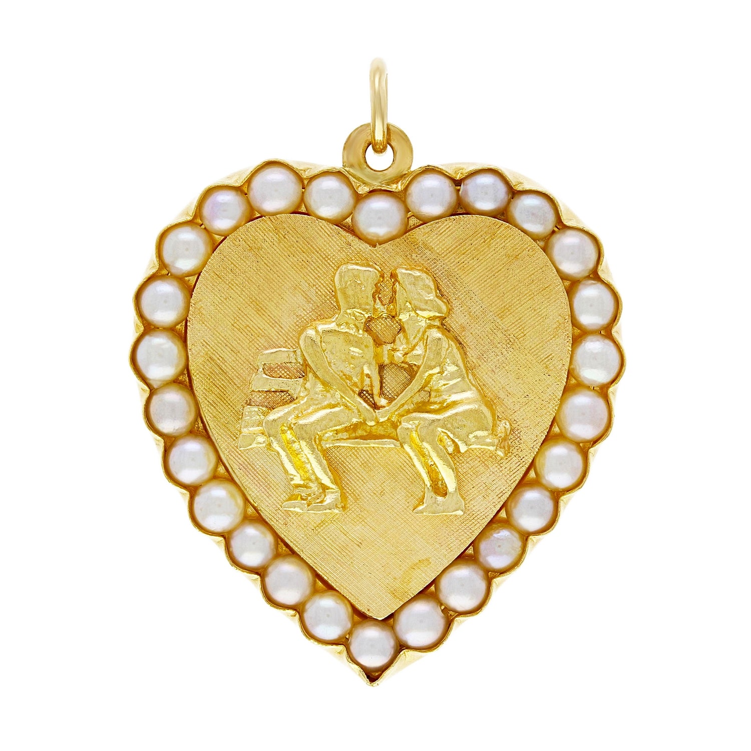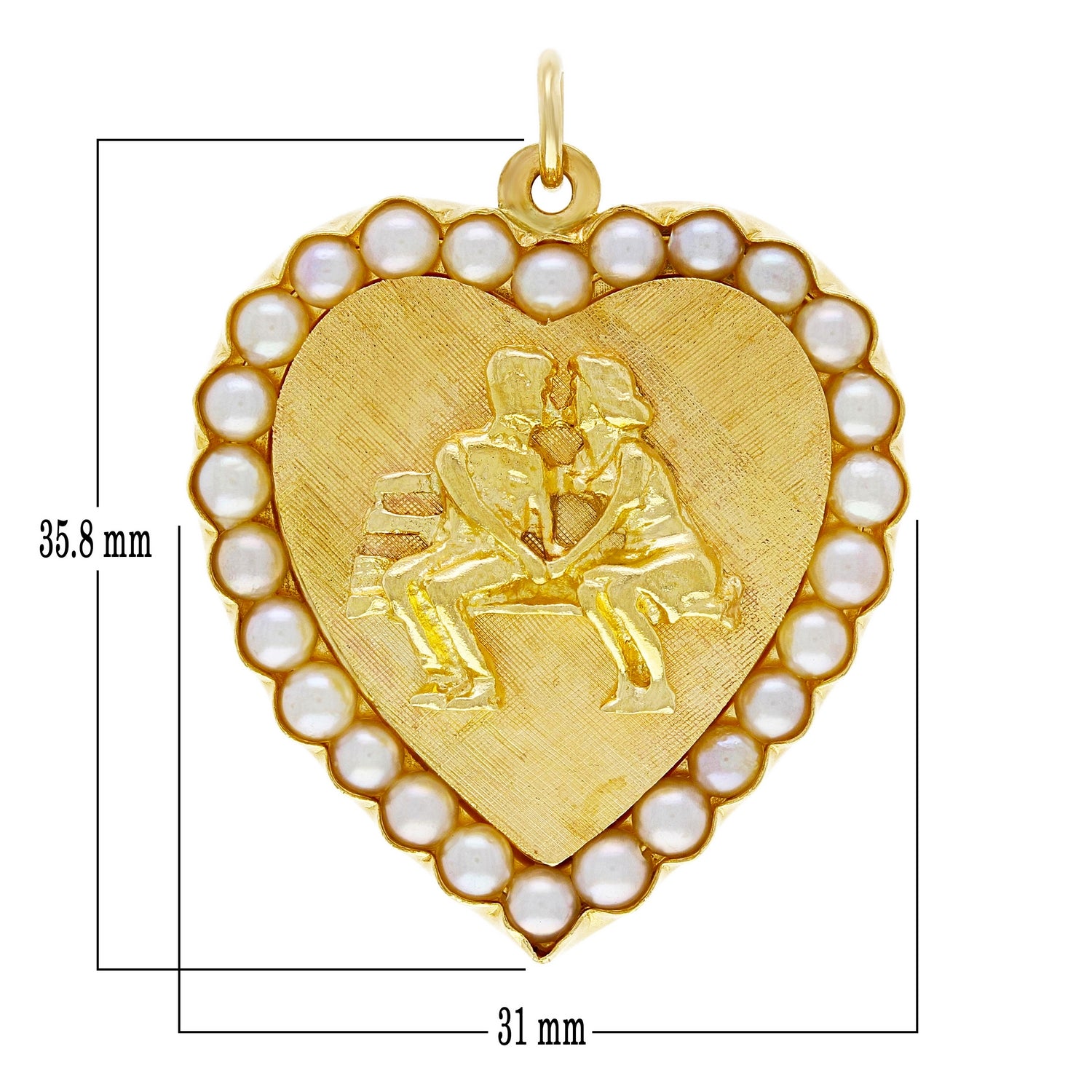 14k Yellow Gold Freshwater White Pearl Romantic Love Couple Heart Pendant