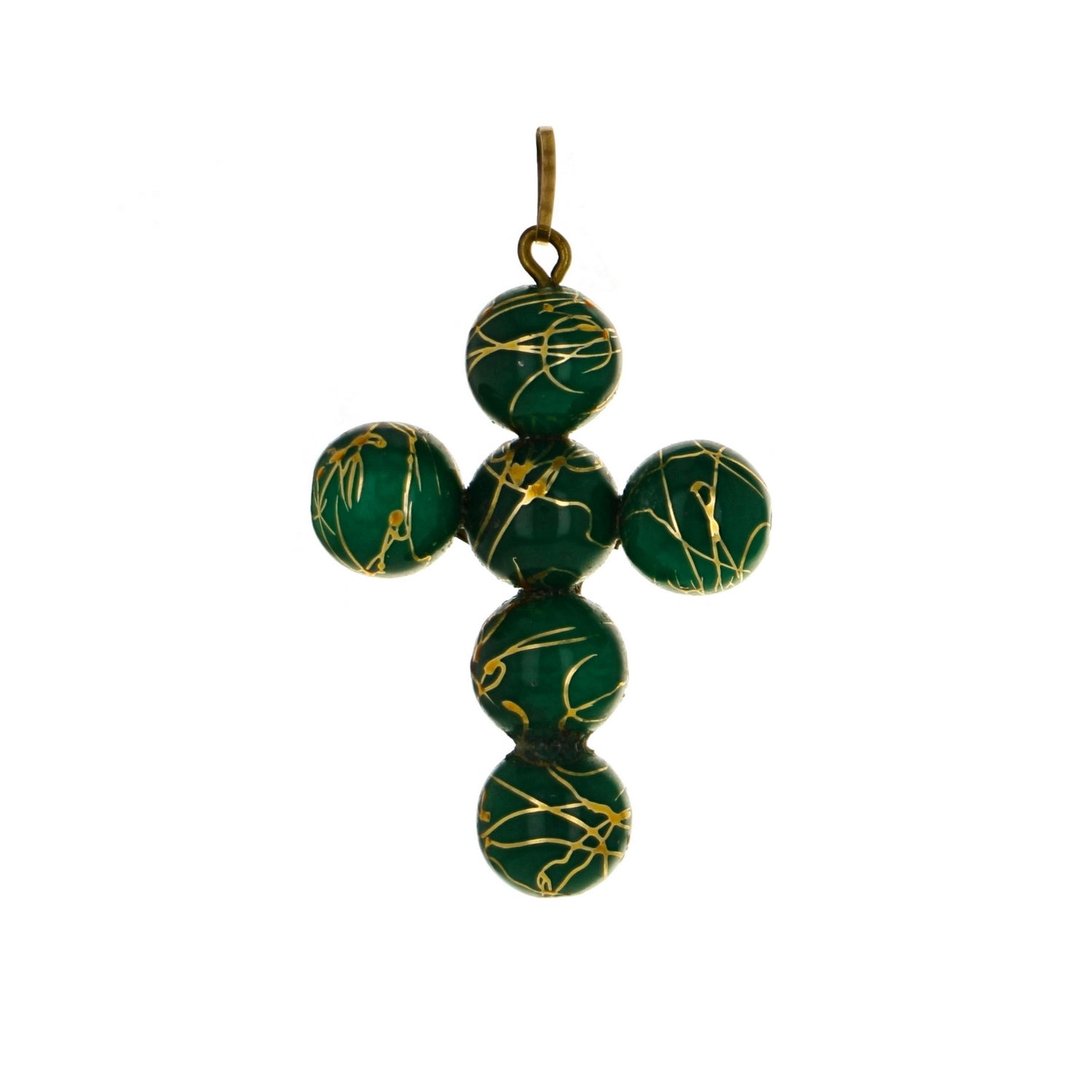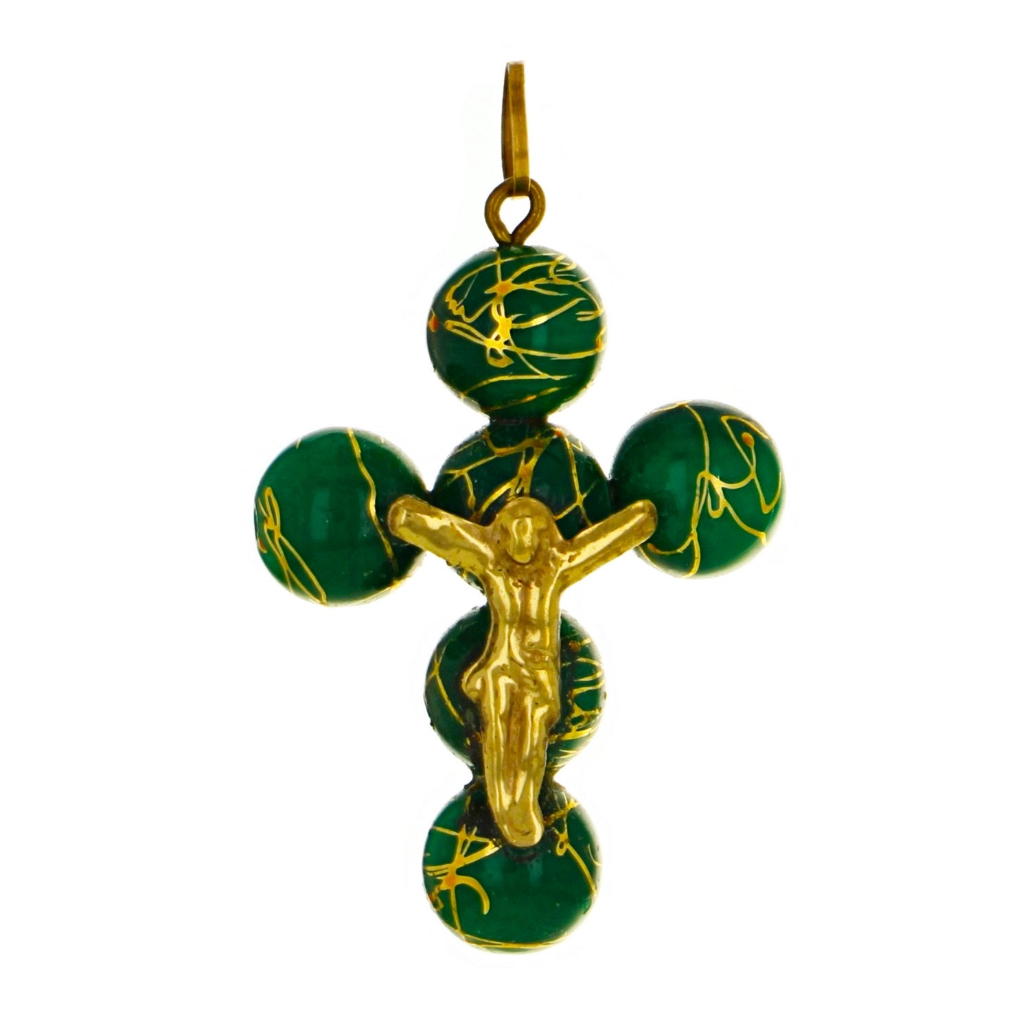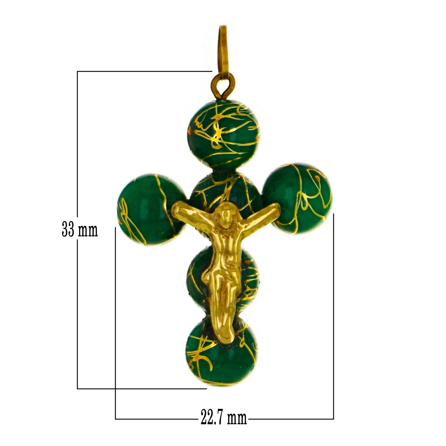 14k Yellow Gold Artistic Crucifix Green Enameled Bead Pendant w/ Oblong Bail