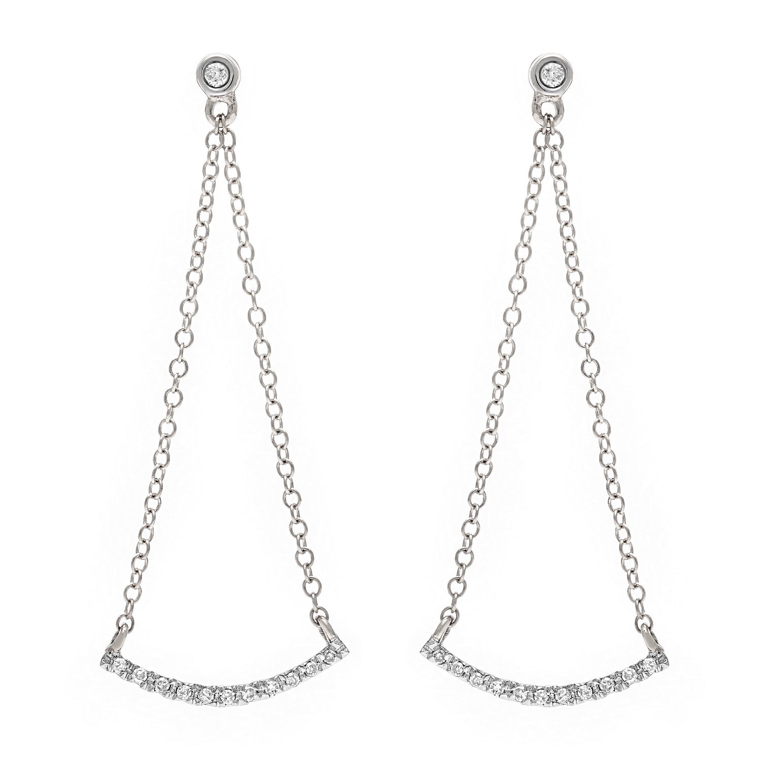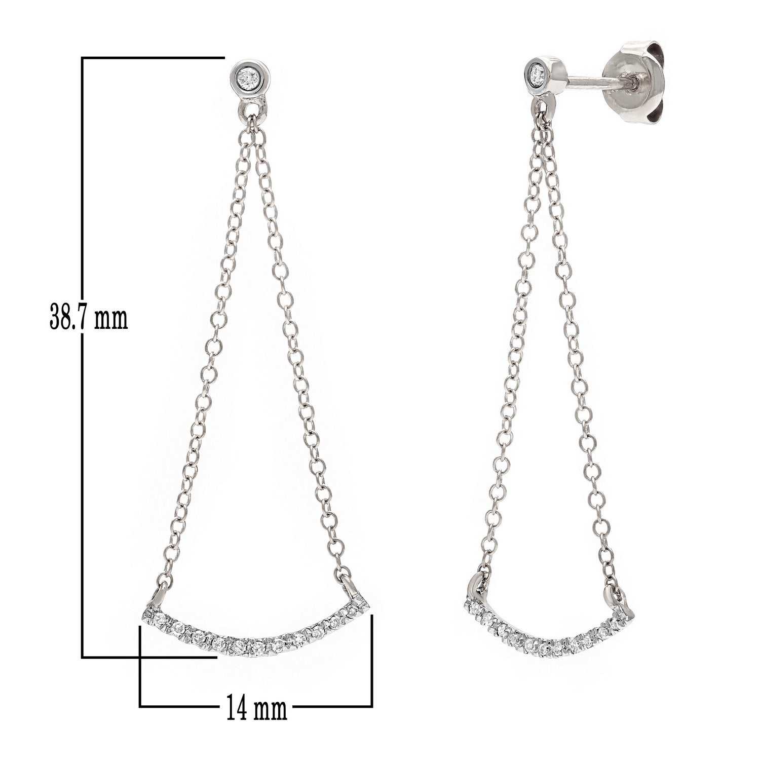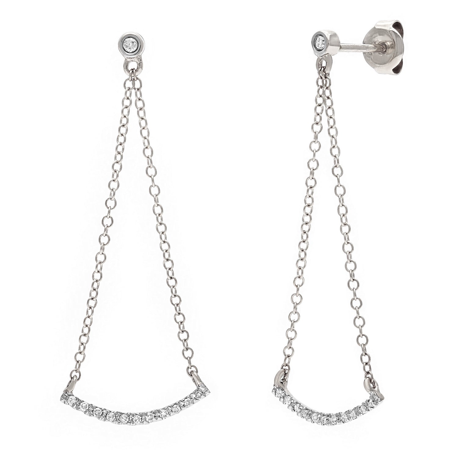 The gentle, graceful shallow curve of the arcs will remind you of a smile! They shine with a bevy of scintillating diamonds set in 14 karat white gold. The horizontal bars are suspended by delicate rolo link chains and meet at diamond-set studs. Friction posts with two notches ensure secure all-day comfort. You'll fall in love at first sight!