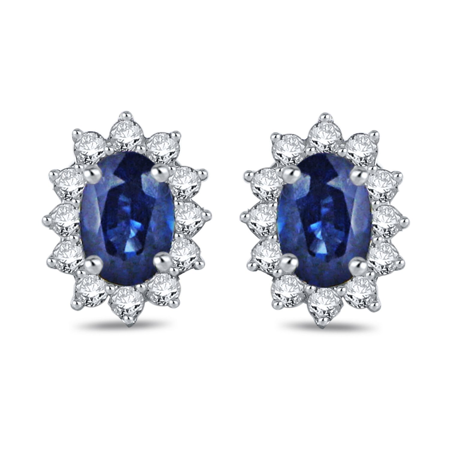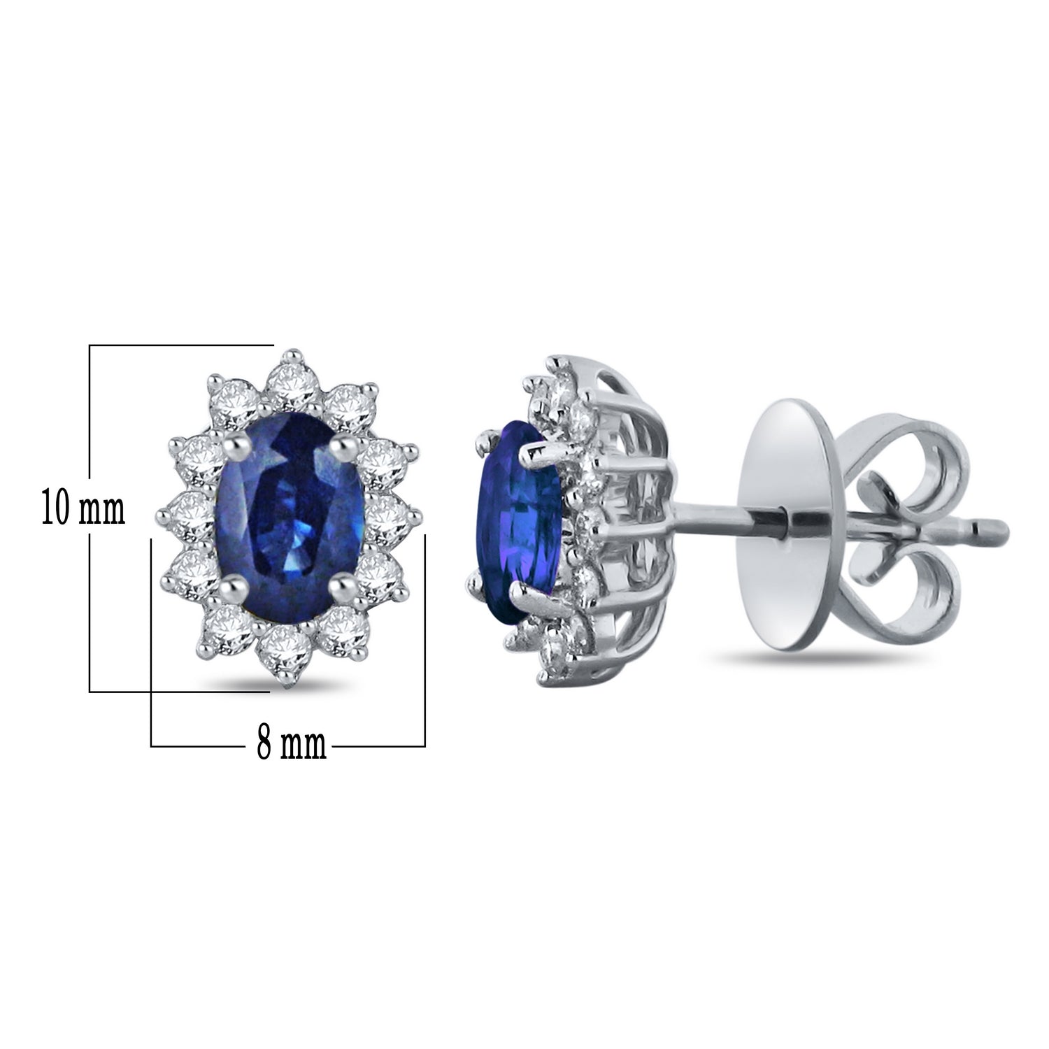 Each 14 karat white gold basket setting holds a halo of sparkling diamonds, surrounding genuine blue sapphire gemstones at center in a classic and elegant oval shape. Friction posts with two notches ensure secure all-day comfort. You'll fall in love at first sight!