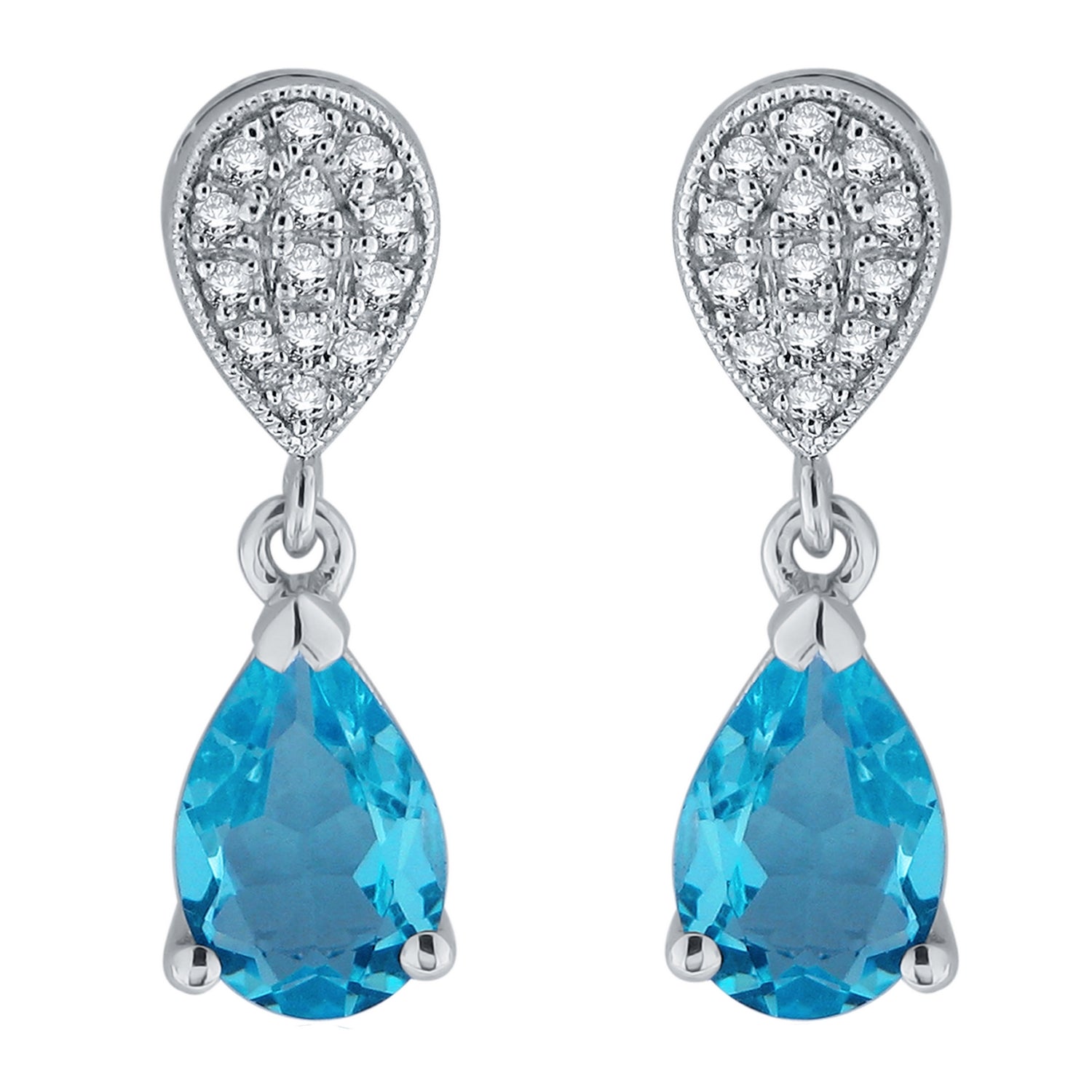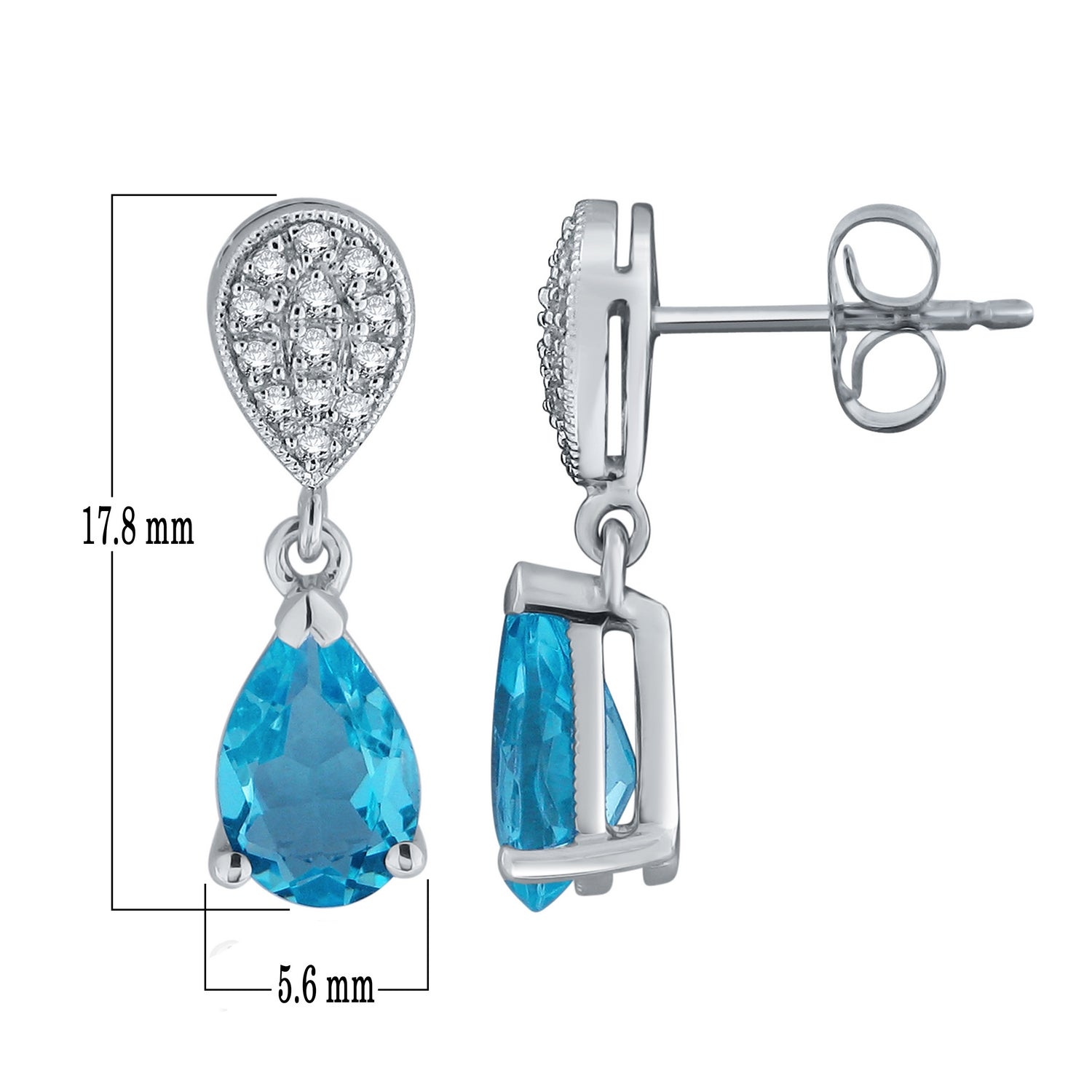 A pear shaped Swiss blue topaz in a bright turquoise color is suspended from a teardrop-shaped diamond-accented button. The dangling precious gemstone will sparkle with your every move. Friction posts with two notches ensure secure all-day comfort. You'll fall in love at first sight!